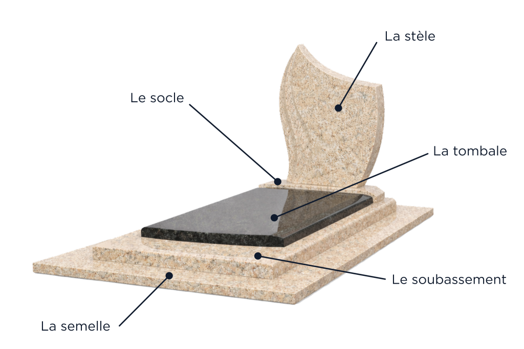 Elle symbolise la personne disparue. La pierre tombale est le monument funéraire le plus courant. Elle se compose d’une dalle (en granit, en pierre ou en marbre) posée sur la sépulture afin de recouvrir et protéger la fosse.